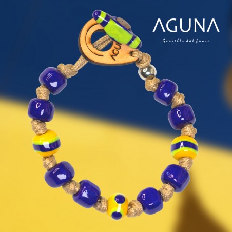 Bracciale fatto con perle di Murano, lavorate a lume con il fuoco e annodate manualmente. Goccia di cuoio con inciso il logo Aguna che serve per annodare il piolino in vetro anch'esso in vetro di Murano.