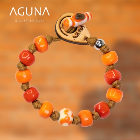 Bracciale fatto con perle di Murano, lavorate a lume con il fuoco e annodate manualmente. Goccia di cuoio con inciso il logo Aguna che serve per annodare il piolino anch'esso in vetro di Murano.