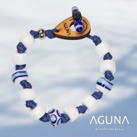 Bracciale fatto con perle di Murano, lavorate a lume con il fuoco e annodate manualmente. Goccia di cuoio con inciso il logo Aguna che serve per annodare il piolino anch'esso in vetro di Murano.