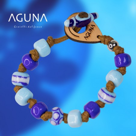 Bracciale fatto con perle di Murano, lavorate a lume con il fuoco e annodate manualmente. Goccia di cuoio con inciso il logo Aguna che serve per annodare il piolino in vetro anch'esso in vetro di Murano.