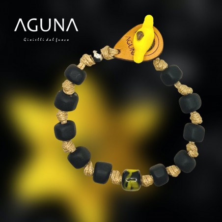 Bracciale fatto con perle di Murano, lavorate a lume con il fuoco e annodate manualmente. Goccia di cuoio con inciso il logo Aguna che serve per annodare il piolino in vetro anch'esso in vetro di Murano.