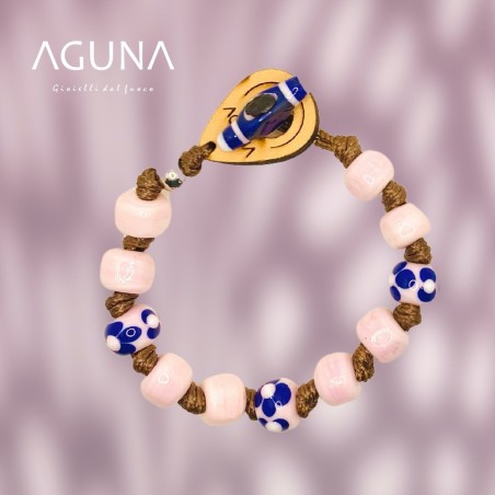 Bracciale fatto con perle di Murano, lavorate a lume con il fuoco e annodate manualmente. Goccia di cuoio con inciso il logo Aguna che serve per annodare il piolino in vetro anch'esso in vetro di Murano.